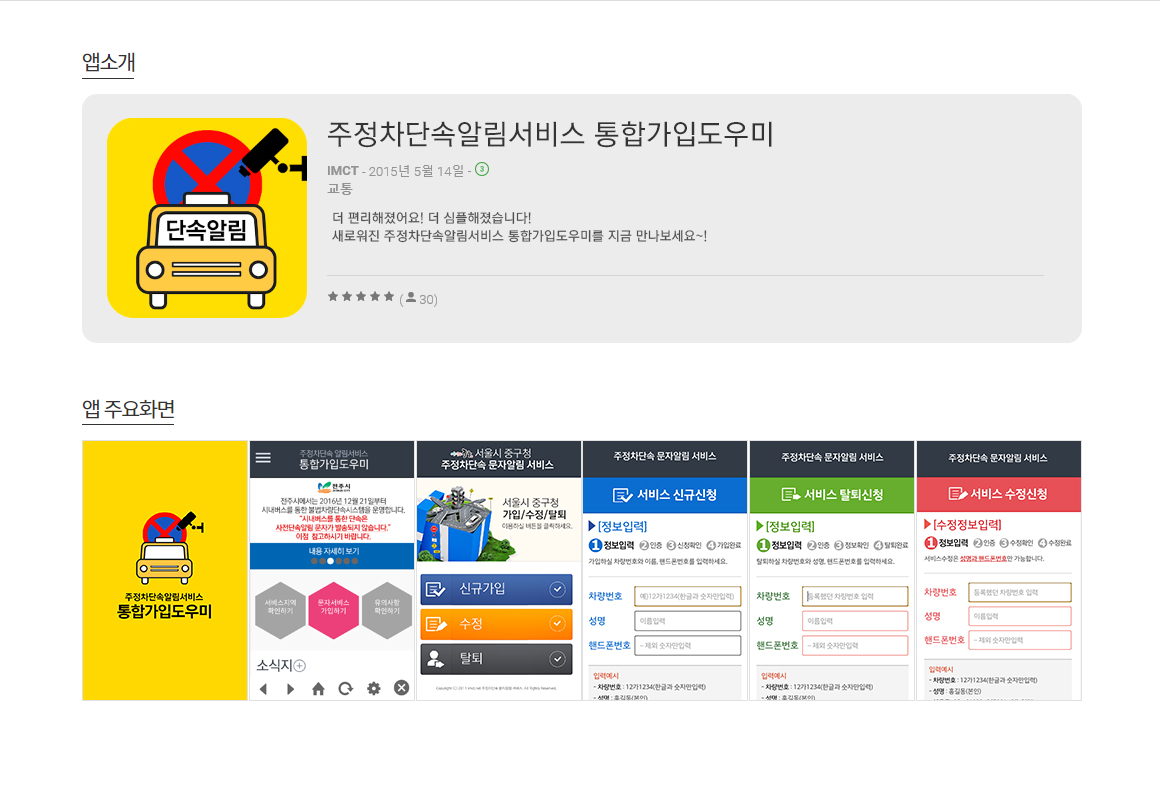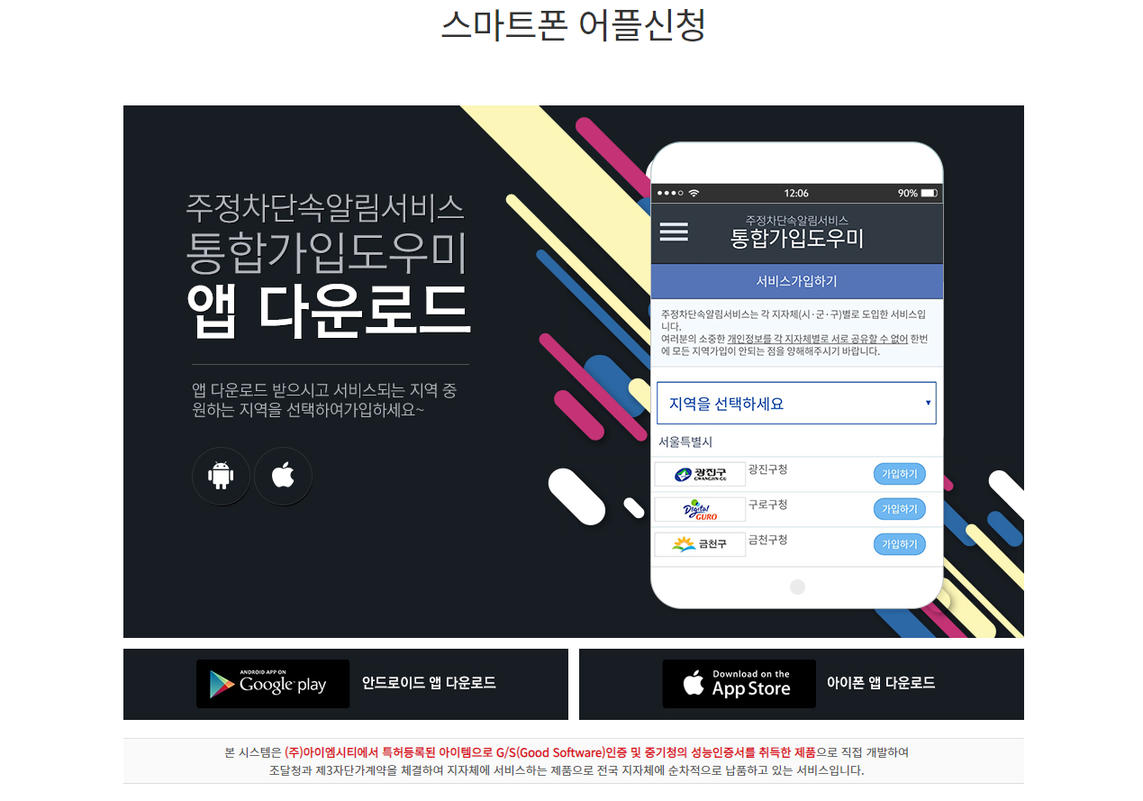 주정차알람서비스 모바일에서는 안드로이드용 및 아이폰 앱스토어용 두 가지 중 본인에 맞는 용을 설치해서 사용하시면 됩니다. 설치 및 가입방법은 사진을 보시고 따라 하시면 쉽게 따라 하실 수 있습니다.
