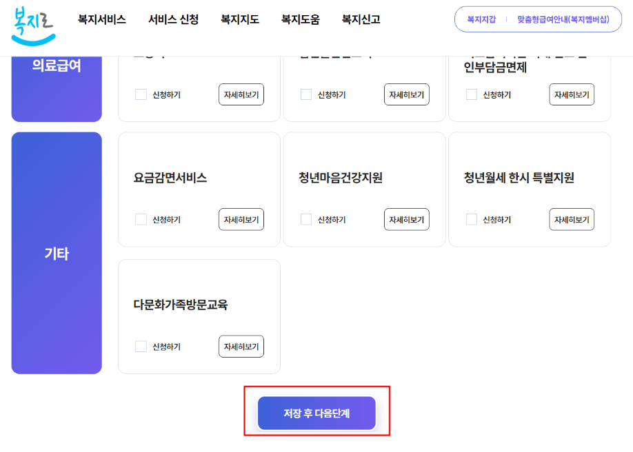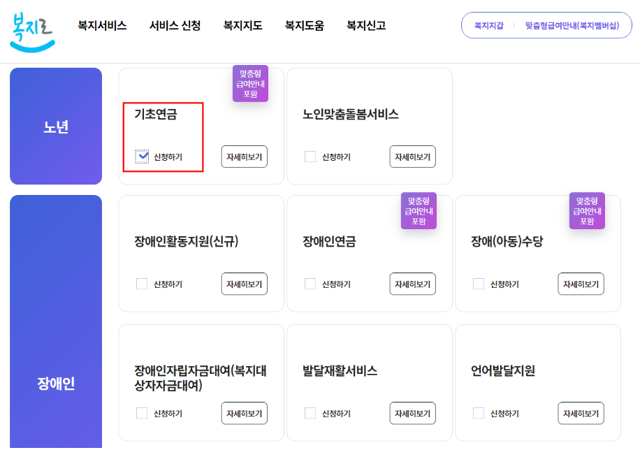 로그인까지 진행하셨다면 여러 서비스 중에 중간 부분에 기초연금을 찾은 후 아래 신청하기를 체크하신 후 맨 아래쪽에 저장 후 다음단계를 클릭해 주세요