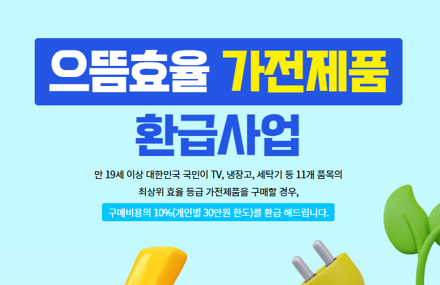으뜸효율 1등급 라벨이 부착된 에어컨, 냉장고, 세탁기, 건조기, 식기세척기만 환급 대상입니다. 제품 구매 전 으뜸효율 홈페이지에서 모델명으로 대상 여부를 미리 확인하세요.